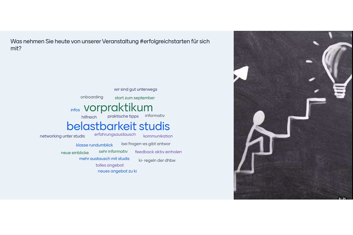 Der Start ins duale Studium stellt für Unternehmen wie auch für Studierende eine entscheidende Phase dar. Welche Faktoren machen den Einstieg erfolgreich – und wie können alle Beteiligten dazu beitragen? Diesen Fragen widmete sich die elfte Ausgabe der Veranstaltungsreihe DHBW Live: Let’s talk about… zum Thema #erfolgreichstarten